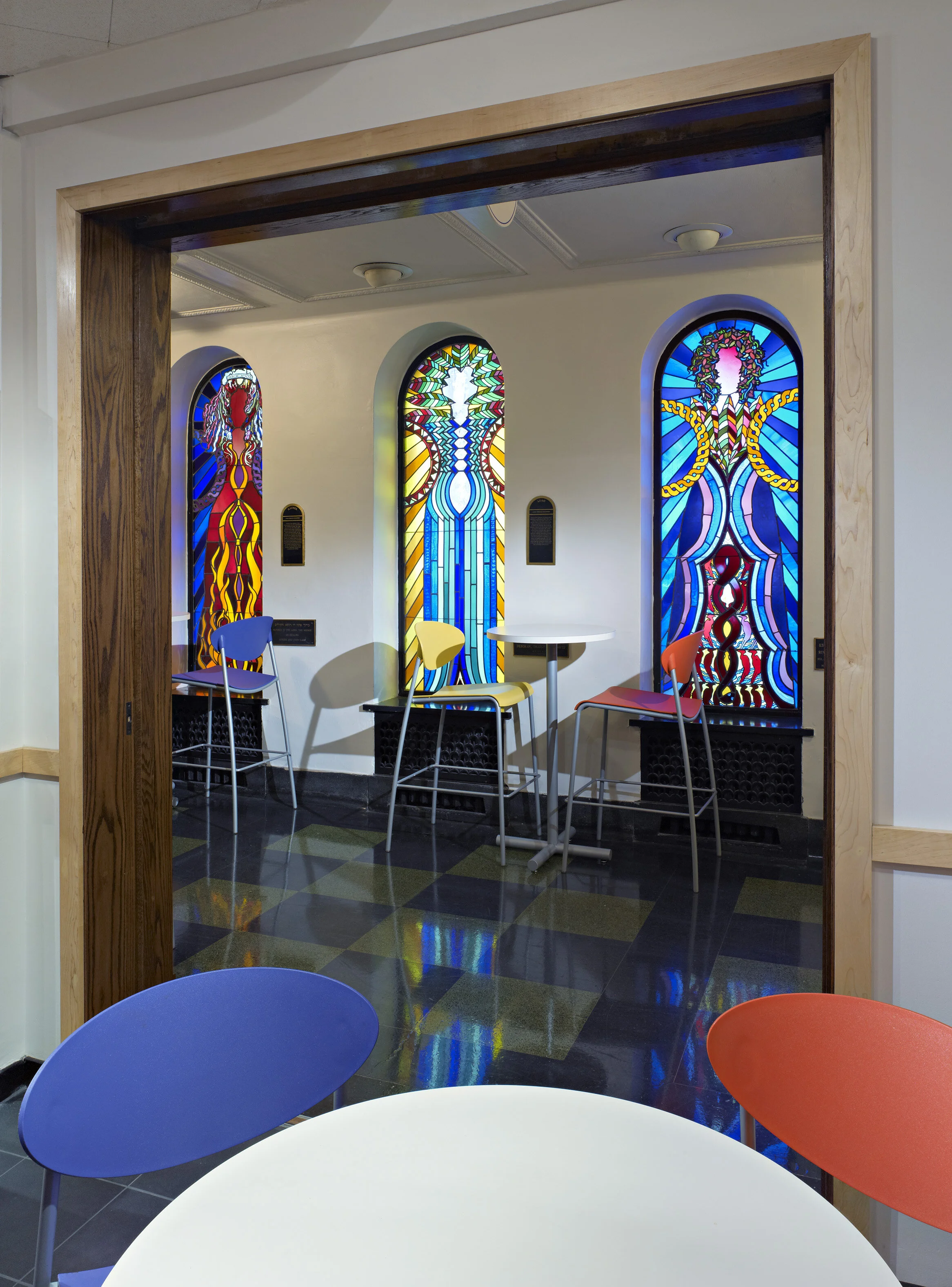 After the preliminary design study was completed as a master plan, and as the first phase of the renovation, the Temple elected to make two changes. The first change was to create a small cafe, Cafe Sholom, in the space that had originally been the coat check room next to the main lobby. The cafe has whimsical furniture and a painted accent wall with bright colors that are inspired by stained glass windows of the matriarchs of the Hebrew Bible at the adjacent corridor. The cafe, only 240 square feet, expands into the adjacent corridor and gives Temple staff, congregants and visitors a place to meet casually for coffee while building a sense of community.