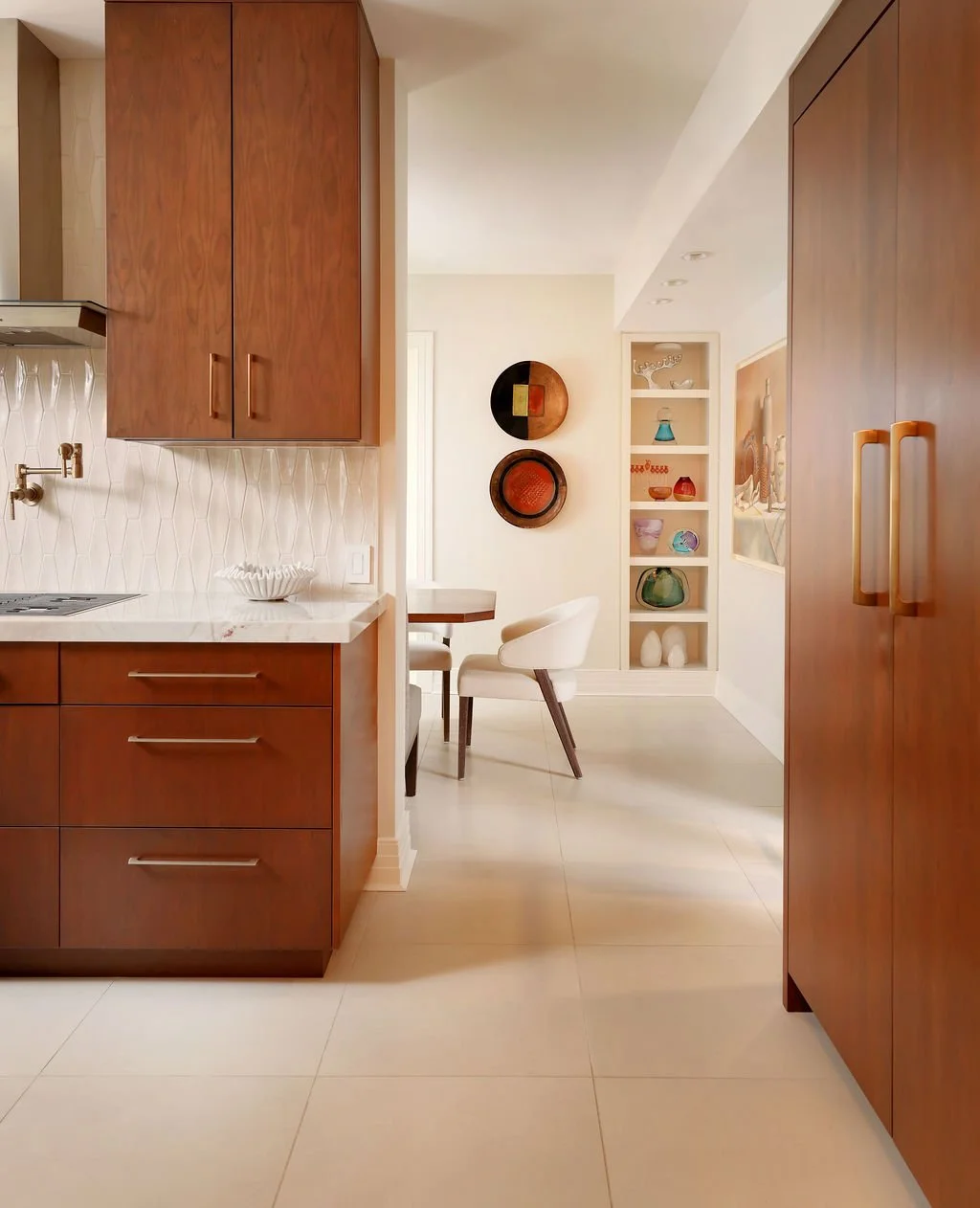 Our clients purchased an apartment in a 100+ year old high-rise building on Lake Shore Drive. The views of the lake are stunning, but the interior spaces needed an update. FDA collaborated with interior designers, Kaufman Segal Design, and worked with our clients to design and build the project in two phases. Phase One focused on renovation of the front of the apartment including the main living spaces, a library/family room, the kitchen, laundry, and powder room. The opening between the library/family room and the living and dining room was made wider and now has a pair of glass and steel sliding doors. The kitchen layout was optimized and outfitted with custom cabinetry and high-end appliances The powder room and adjacent laundry area were reconfigured creating more functionality and an improved flow.